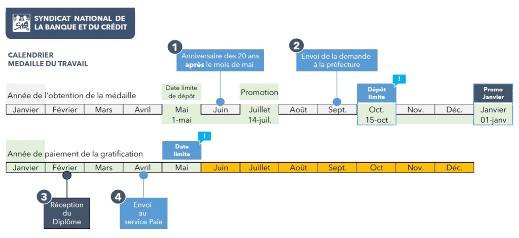 Ainsi, pour un échelon de médaille, par exemple 20 ans, au 1er juin de l’année en cours la demande à l’administration doit être envoyée avant le 15 octobre pour que le diplôme soit disponible pour la promotion du 1er janvier de l’année suivante. Le dossier complet peut alors être déposé chez LCL le 31 mai de l’année suivante au plus tard, soit dans les 12 mois suivant la date anniversaire des 20 ans d’ancienneté.