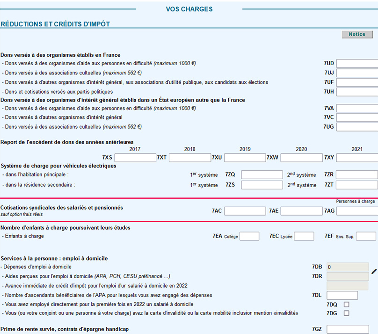 Pour les salariés et pour les retraités, les cotisations syndicales ouvrent droit à un crédit d’impôt. Elles sont à reporter en case 7AC (déclarant 1), 7AE (déclarant 2), 7AG (personnes à charge).